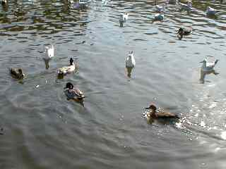 2001-3-19 cabinさんは今日の桜写真を撮りに行ったときに、ミニ木蔵で鴨対ユリカモメの餌をめぐる戦いを目撃しました。状況写真 誰かが鴨に与えた餌なのですが、もうそろそろ旅立つ準備をしているのでしょうか鴨さんは余り食欲がない模様です、水面にはぷかぷかと餌が浮いていました。鴨は人間を恐れずに人の近くで気が向くとちょっとだけ餌をついばんでいますが、以前の様には喜びません。餌を与えた人もそんなわけで早々に引き上げてしまうと、ユリカモメの餌取りが始まりました。手すりや池の人のいないほうにいたユリカモメはヒッチコックの映画の様に飛んでくると、一瞬のホバリングの後そこにいる鴨をものともせずに餌を掠めるのです。あんなに可愛い顔には不釣合いなほど、攻撃的にやってきます。水上の鴨 対 空中のユリカモメ やはり機動力に勝る ユリカモメの圧勝でした。残念ながらcabinさんのデジカメでは決定的な写真を撮る事が出来なかったのですが、望遠レンズ付きでシャッター速度の速い写真が撮れるカメラならば、大自然の姿が 街の中の公園で撮る事が出来ます。期間は鴨さんが旅だつ日までもうすぐです。だってCHOCO橋本菓子店のサービス係りの猫なんだモン