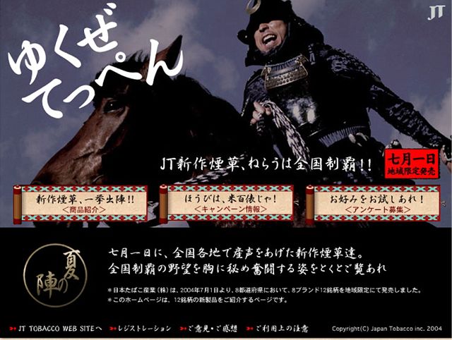 さらにこちらはHTMLバージョンも用意されているって事もあります。同じく掲示板にも書きましたし一般新聞にも載ったサイト書き換えによる「トロイの木馬」送り込み事件があります。これに対応するにはセキュリティ設定で「高」を設定するのが一番効果的かつ安全なのです。ところがFlash・JAVAを使用したページはセキュリティ設定「高」では閲覧不能なのです。大事なお客様の安全を守ると言うのは企業として一番の基本です。こんどのJT新作煙草サイトはそれが出来ている点だけでも評価に値します。閲覧してみたいと思った方は ttp://www.jti.co.jp/JTI/tobaccobrand/jtad.html (頭の”h”を抜いてあります=Linkにしない為)をご覧くださいませ。