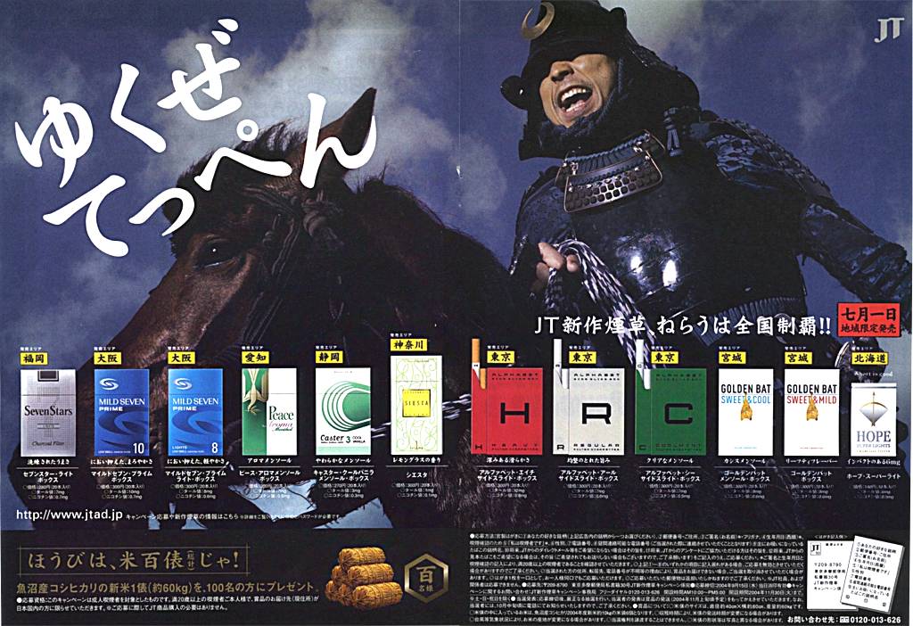 JTさんの登録制タバコ情報ページに「ゆくぜてっぺん JT新作煙草サイト」がオープンしました。北海道から九州福岡県まで全国8都道府県で7月1日付で限定発売された合計12銘柄の新作たばこの紹介ページです。WEBサイト限定のキャンペーンとして『ほうびは米俵じゃ!』も企画されています。なんと抽選で100名様に魚沼産コシヒカリ新米一俵(約60kg)を「どっかーんとプレゼント」してくれるそうです。 ◎北海道限定のホープスーパーライトだったら『きらら397』宮城県限定のゴールデンバット2種類だったら『ささにしき』か『ひとめぼれ』 そこまで凝ってもらいたいの気もしますが、東京のお米って考え付かないの・・・(笑)