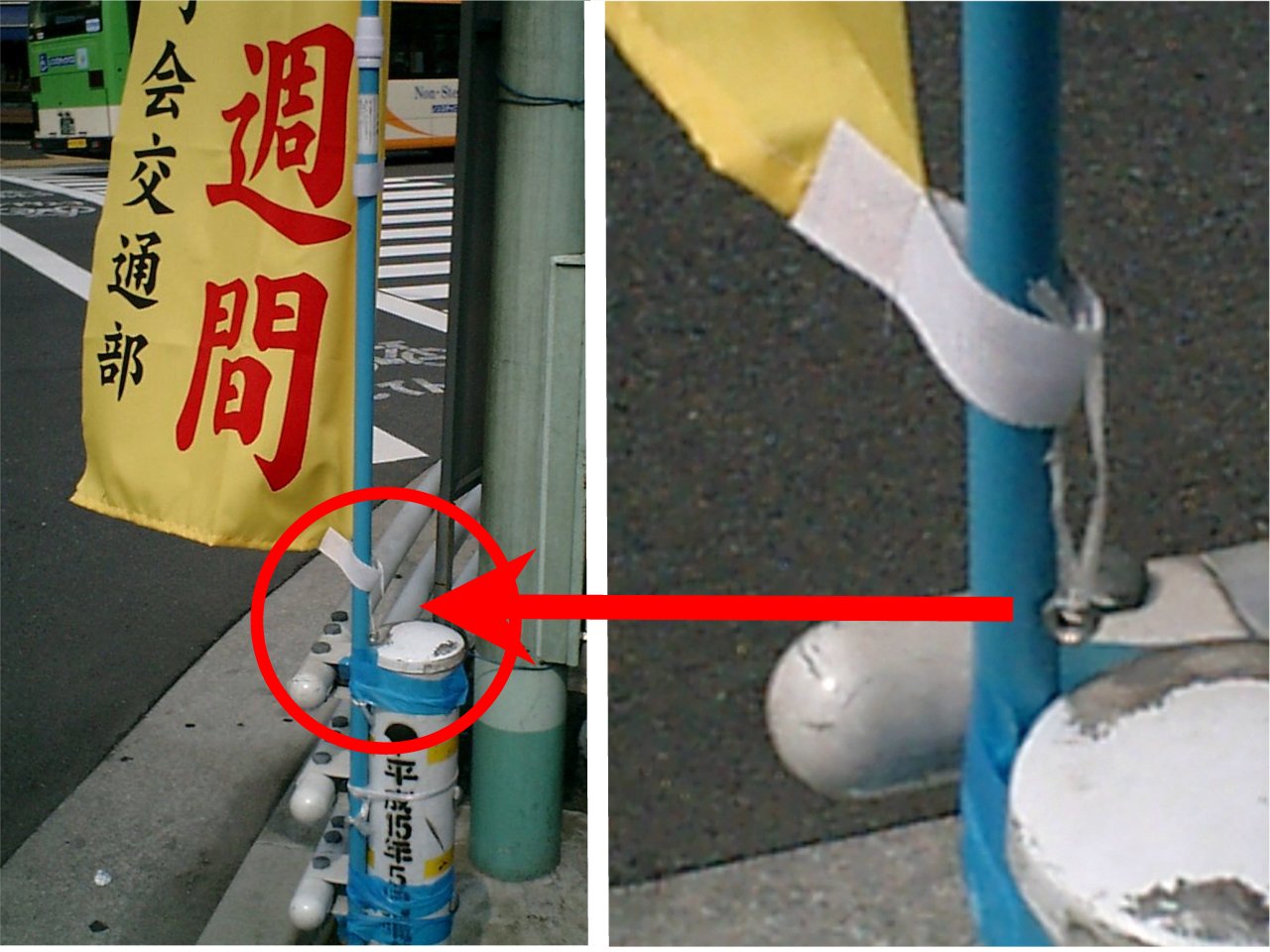 この手ののぼり旗って少し風が強いと巻く舞ってしまう事が多いのですが、それでは交通安全の役に立ちません。巻く舞ってしまう原因は風の方向によってどちらにも回るよう幕の根元が固定されていないせいで、風に吹かれるとその根元部分が持ち上がってしまう事にあります。かと言って根元を固定するのは駄目。それで根元に錘を付けたのです。っていっても理事の自転車屋さんちのナット。それに紐を通して旗の根元部分にぶら下げただけ。more