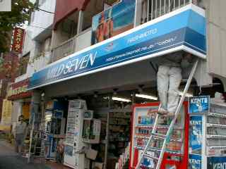 そしてもう1つあの有名な風邪薬&痛み止めのアスピリン・バッファリン(ドイツバイエル社・ライオン社の商標)にも有名な副作用の情報があるのですね。アレルギーを引き起こす事があるのと、血小板凝集阻害作用ヲ持っていて出血をしやすくするので、胃潰瘍や脳出血の恐れのある人は使わないほうが良いこと、また妊婦・胎児に対する影響として:分娩遅延.また妊娠末期での投与は胎児動脈管の早期閉塞を生じ,死産あるいは流産の危険性があるそうです。こんな事もCHOCOは知りませんでした。あ〜ぁ世の中知らないことだらけだよ。だってCHOCOまだまだ生まれて3年目の猫なんだモン2000-11-6 ジャジャーン 今日お店のJTさんのマイルドセブンのテントが新しくなりました。この写真をよ〜く見て下さい。右側のほうに何か書いてあるのが分かりますか?そうcabinさんのURLが載っているのです。これがそうですが・・・これが新しいお店の新しい電話番号だと思ってくださいね。なんたってCHOCOインターネット猫だもんね。聞いた所では弊社の設置事例ではURL入りは日本初 だそうです。でも全部のお店がとは言わないけれど多くのお店がURLをテントや看板に入れるようになる時代がすぐそこに来ているような気がするのはべつにCHOCOだけではないよね。今だって名刺にメールアドレスを書いたり、年賀状にアドレスを書くのが普通の事になっています。まだホームページまではそうは多くはなさそうですが、だけどホームページで情報を発信して行くのがお客さんの為のサービスになるとcabinさんは信じています。CHOCOはお客さんのお相手(接客係)をするのが一番だと思っているのですけれど、cabinさんがお店番していると怖がってはいってこない人もいるからしょうがないですね。アッこれはcabinさんには内緒だからね!