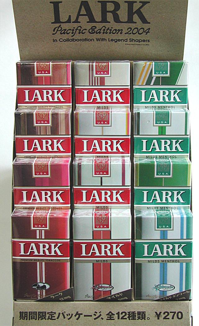 本日入荷したラーク2004パシフィックエディション期間限定パッケージです。ラークBOX・ラークマイルドBOX・ラークマイルドメンソールBOXの3銘柄に各4種類の絵柄がございます。今日は試しにそれぞれ10カートンずつ取ってみたのですが、カートンに対して普通は1種類の絵柄が入っています。だから30カートンでは12種全部はありませんでした。担当の営業氏によると普通のお店ではそれほどまとめて取らないとの事。ってことはお客様が12種集めようとすると意外と苦労するかもしれません。