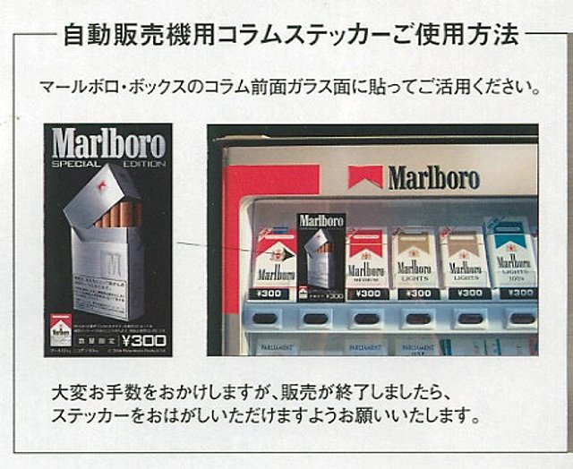 やはりPMさんのMarlboro スペシャルエディション2006にも企画倒れ(練り込み不足)があったようです。左側の画像はメーカーさんの自動販売機用ステッカーなのですが、これを貼った自動販売機での売り上げが目に見えて落ちています。弊店で装填している自動販売機では通常の赤い箱のMarlboroとスペシャルエディションを別コラムにして併売していますが、このメーカー純正ステッカーの効果は素晴らしく、売り上げ比率はなんと20対1。。。 (>_<)